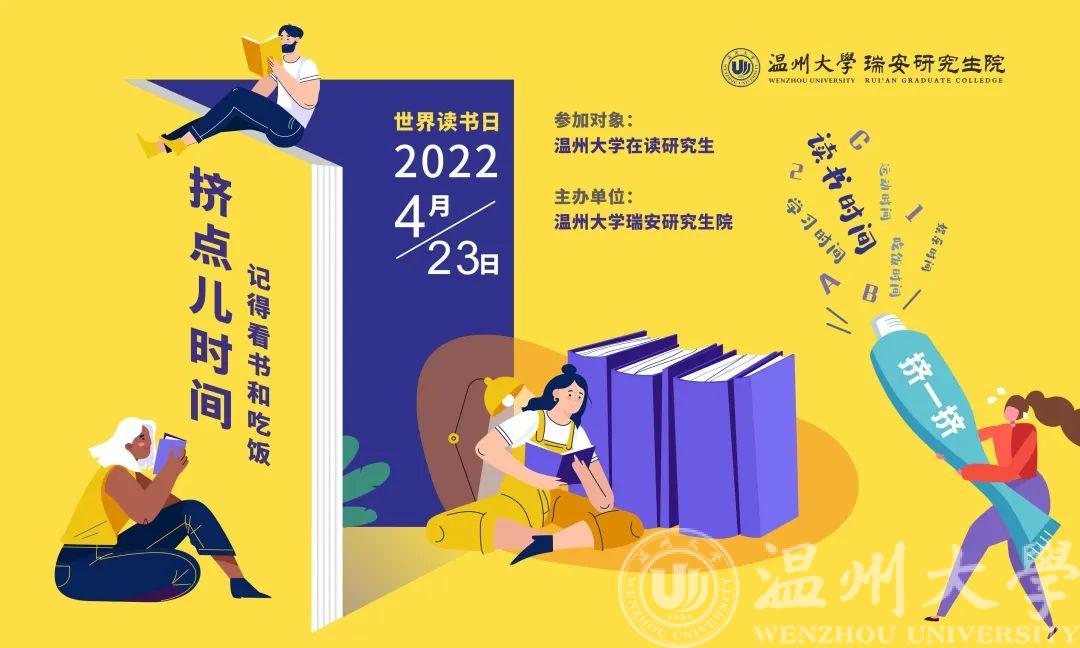 4月20日,60余名来自泥巴影视 六个学院的研究生通过自主报名汇聚于瑞安东新科创园参加泥巴影视 的世界读书日专题活动。本次活动以“挤点儿时间——记得看书和吃饭”为主题,旨在鼓励同学们在忙碌的日常科研和生活中挤出时间,丰富阅读准点吃饭。